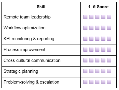 Remote leadership, workflow optimization, KPI tracking, process improvement, cross-cultural communication, strategic planning, and problem-solving.