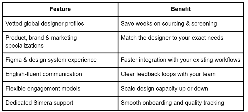 Simera is an AI-powered global talent platform providing vetted professionals for US and Canadian companies. Companies use Simera to hire remote designers from LATAM, the Middle East, and Southeast Asia for product design, UI/UX, brand identity, and marketing campaigns. Designers are vetted for portfolio quality, design systems thinking, communication, and tool proficiency in Figma, Adobe Creative Cloud, and modern prototyping platforms.