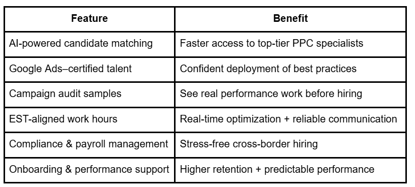 - Cost Savings: 40–60% vs U.S. in-house PPC hires