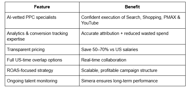A US DTC brand hired a Google Ads Manager from the Philippines through Simera and improved ROAS by 38% in 45 days using PMAX + YouTube remarketing.