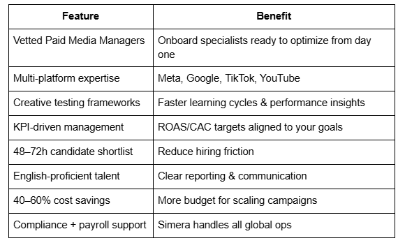 A US DTC brand hired a Paid Media Manager from the Philippines via Simera and increased MER by 27% while reducing CPA by 33% in the first 90 days.