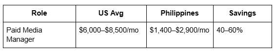 With salaries 40–60% lower than US hires, companies can redirect savings into creative testing, ad spend, and CRO.